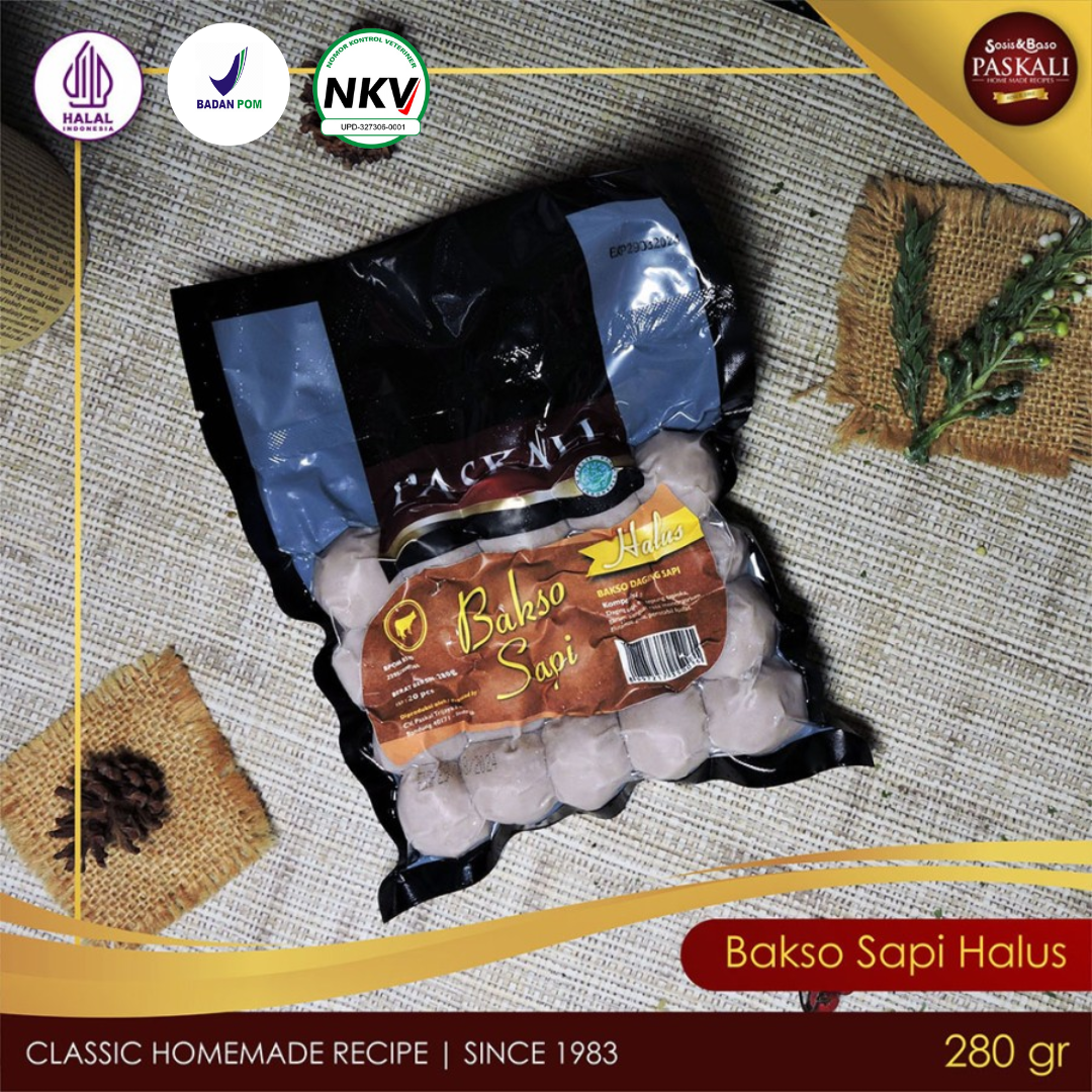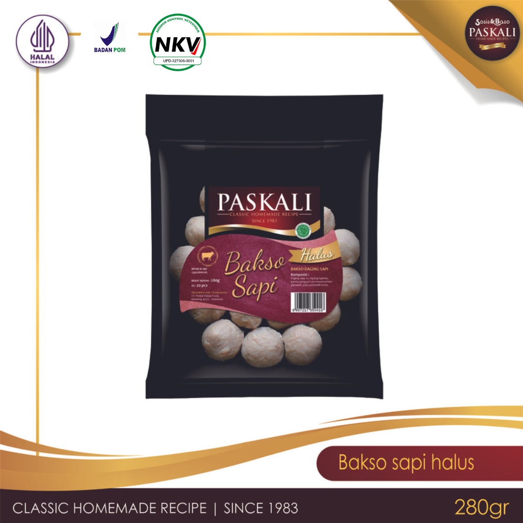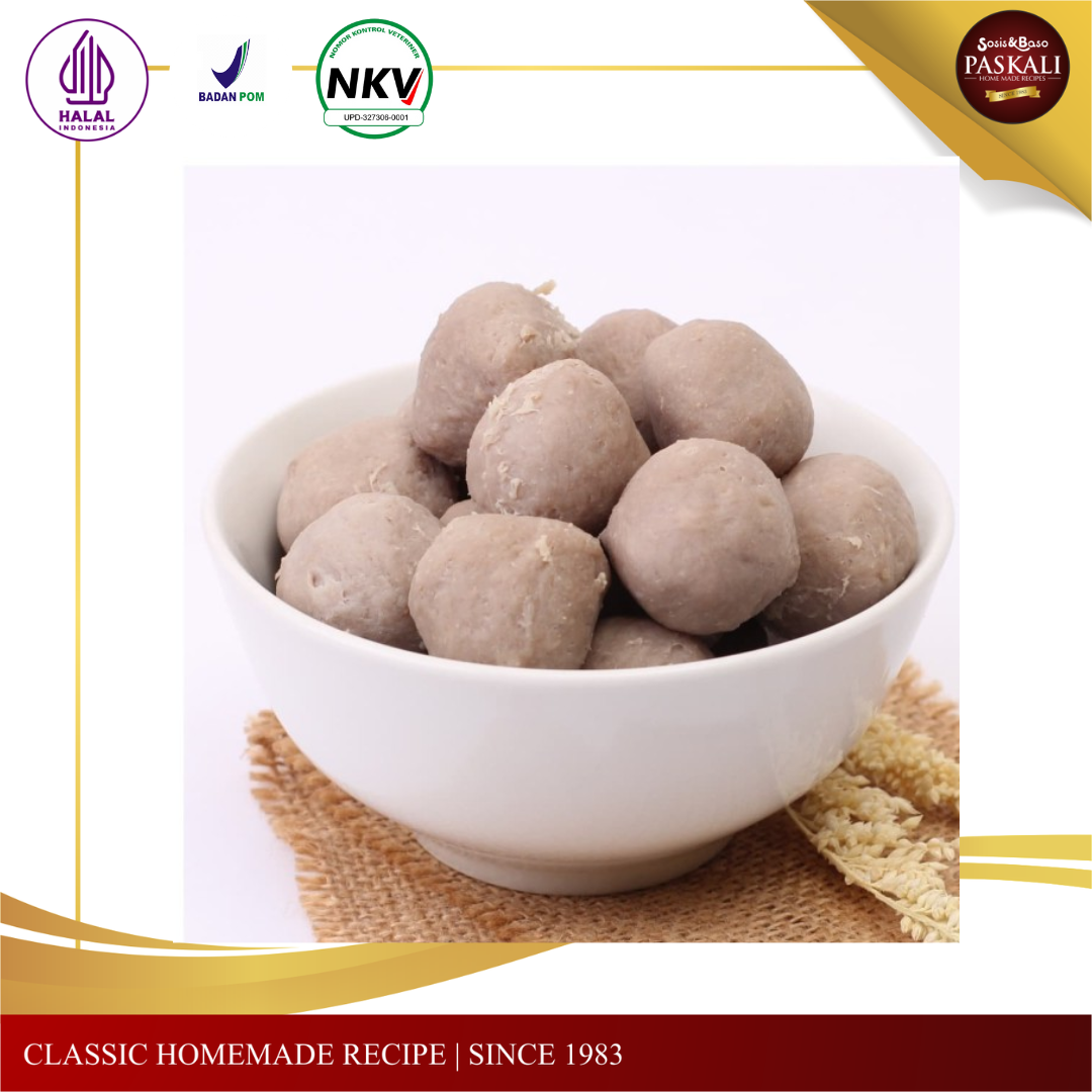 Bakso sapi halus Paskali terbuat dari daging sapi giling dengan resep klasik Paskali sehingga menciptakan rasa yang nikmat dan lezat.