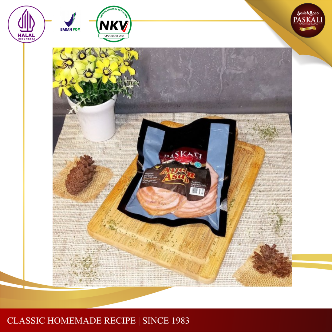 Smoked chicken sliced terbuat dari daging ayam pilihan yang diolah secara higienis dan dibumbui oleh rempah pilihan Paskali kemudian diasap.